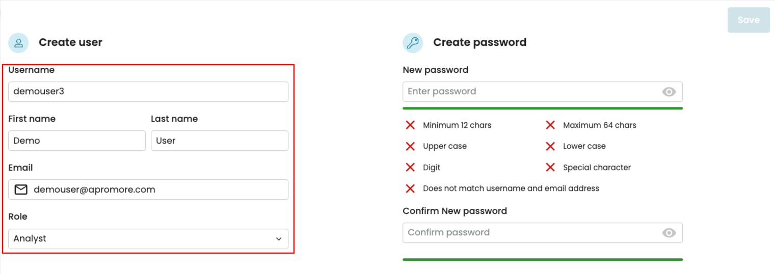 Enter the username, first name, last name, email, and role.